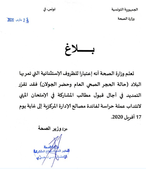 محظة هامة : تقر التمديد في المناظرة إلى غاية يوم 17 أفريل حسب بلاغ أعلنته وزارة الصحة