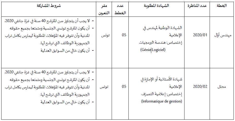 يعتزم مركز الإعلامية لوزارة المالية إنتداب مهندسين ومحللين إختصاص إعلامية وذلك حسب الخطط والشروط المبينة بالبلاغ التالي: